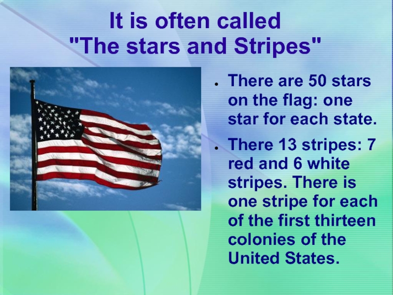 There 13 stripes: 7 red and 6 white stripes. There is one stripe for each of the first thirteen colonies of the United States.