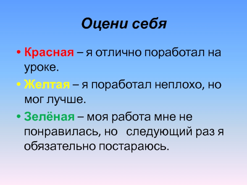 Оцени себяКрасная – я отлично поработал на уроке.Желтая – я поработал неплохо, но мог лучше.Зелёная – моя
