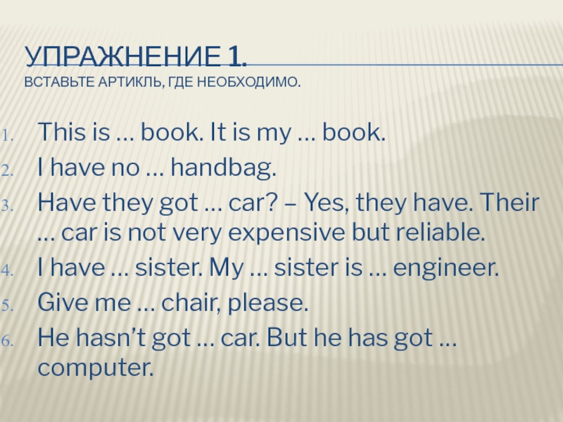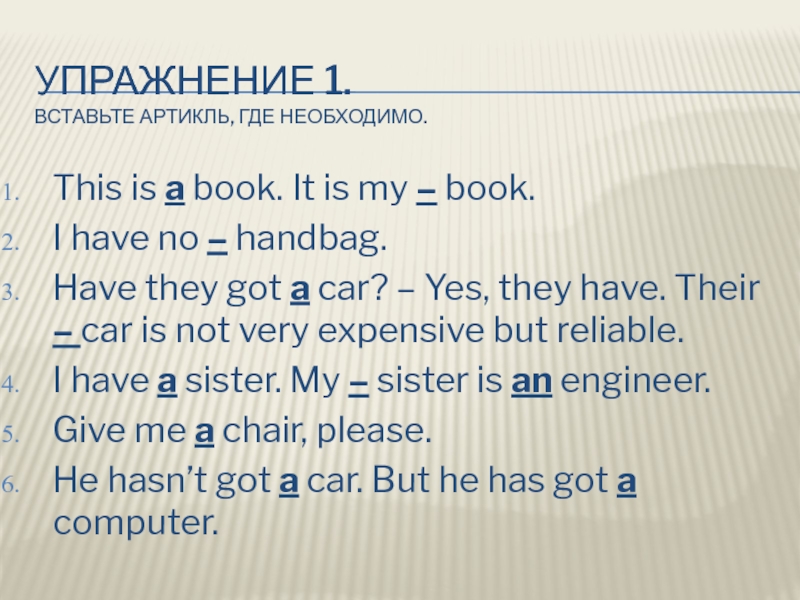 Упражнение 1. вставьте артикль, где необходимо.This is a book. It is my – book.I have no –