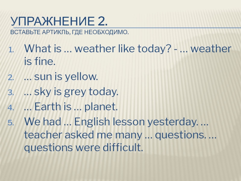 Упражнение 2. вставьте артикль, где необходимо.What is … weather like today? - … weather is fine.… sun