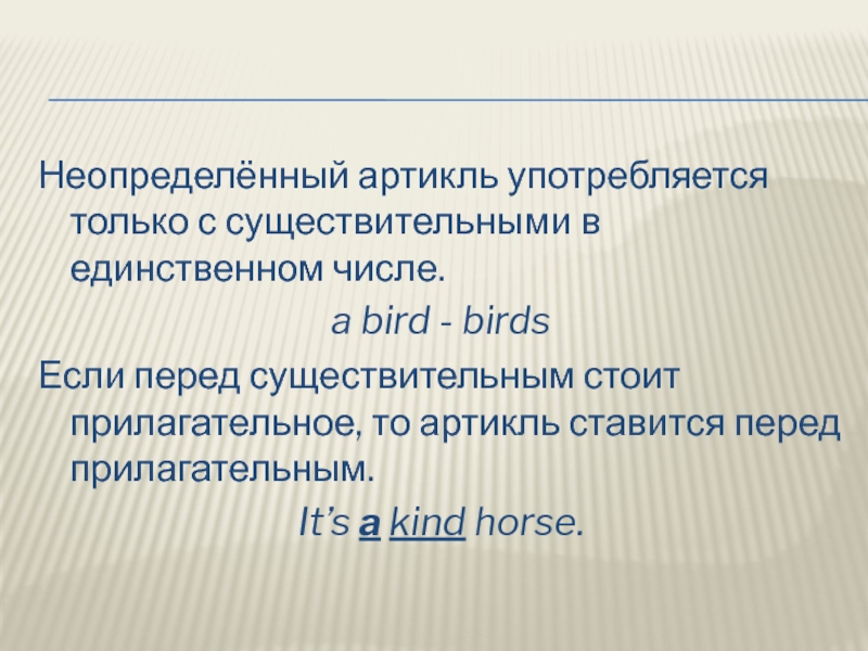Неопределённый артикль употребляется только с существительными в единственном числе.a bird - birdsЕсли перед существительным стоит прилагательное, то