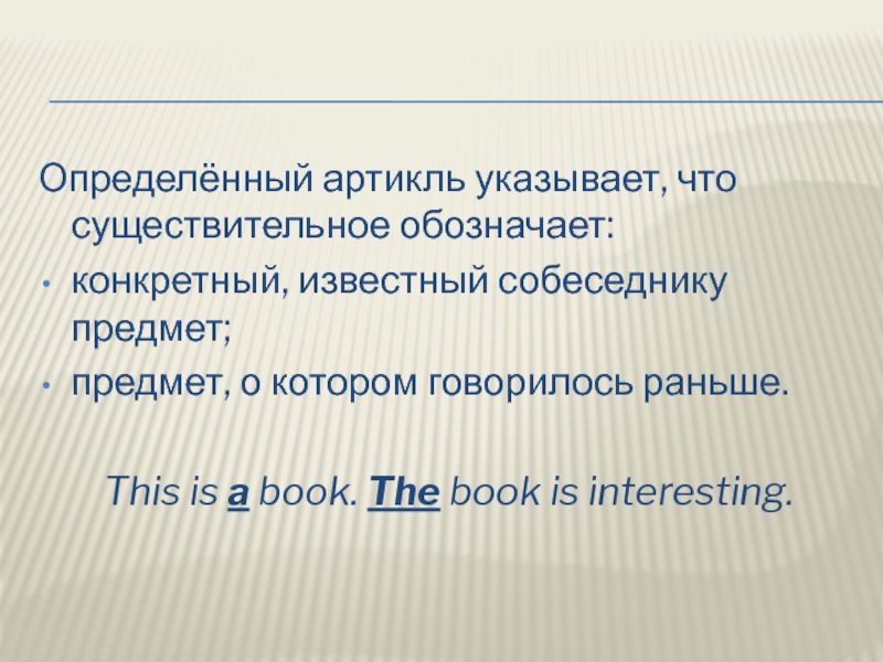 Определённый артикль указывает, что существительное обозначает:конкретный, известный собеседнику предмет;предмет, о котором говорилось раньше.This is a book. The