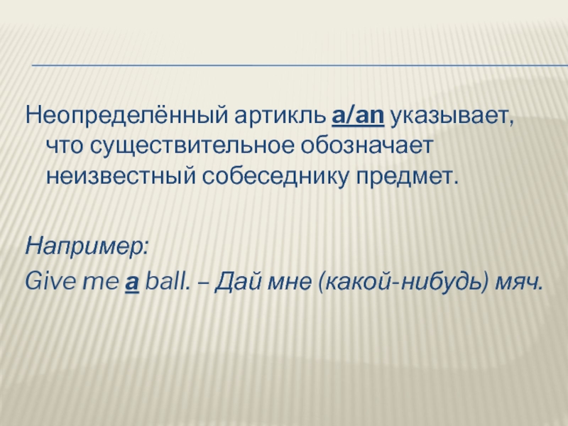 Неопределённый артикль a/an указывает, что существительное обозначает неизвестный собеседнику предмет. Например: Give me a ball. – Дай