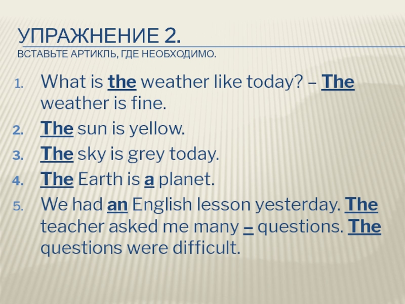 Упражнение 2. вставьте артикль, где необходимо.What is the weather like today? – The weather is fine.The sun