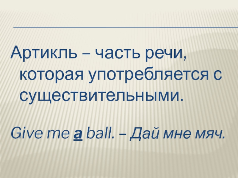 Артикль – часть речи, которая употребляется с существительными.Give me a ball. – Дай мне мяч.