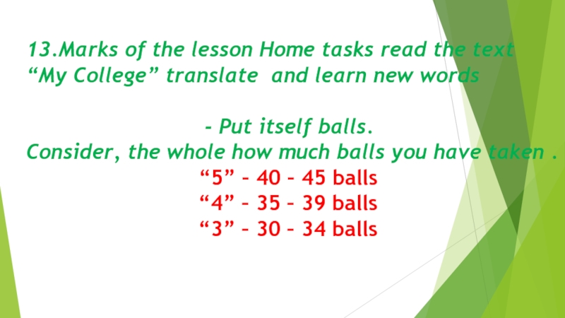 Слайд 2013.Marks of the lesson Home tasks read the text