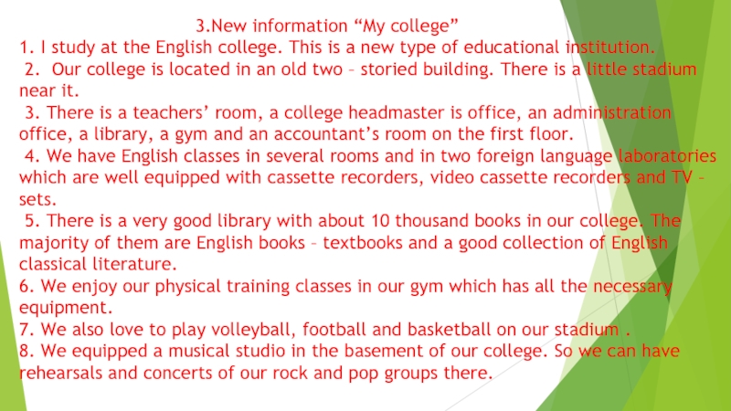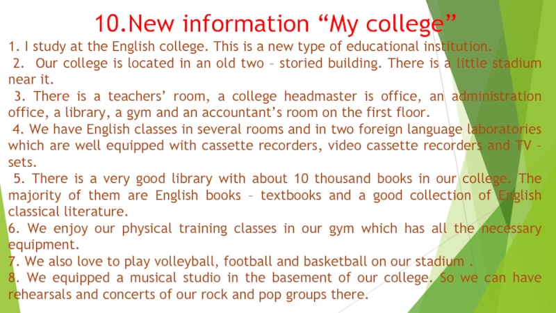 5. There is a very good library with about 10 thousand books in our college. The majority of them are English books – textbooks and a good collection of English classical literature.