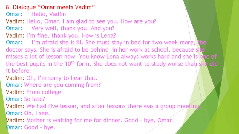Omar: I’m afraid she is ill. She must stay in bed for two week more, the doctor says. She is afraid to be behind in her work at school, because she misses a lot of lesson now. You know Lena always works hard and she is one of the best pupils in the 10th form. She does not want to study worse than she did it before.