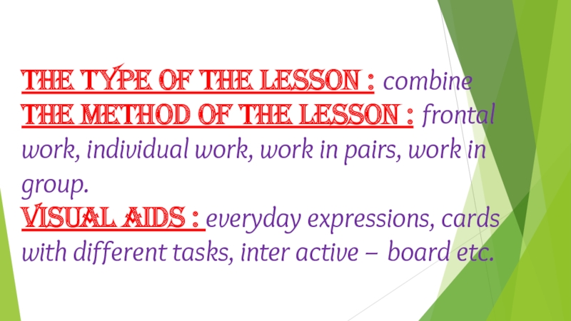 Visual aids : everyday expressions, cards with different tasks, inter active – board etc.