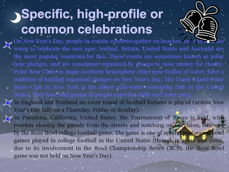 countries gather on beaches and run into the water to celebrate the new year. Ireland, Britain, United States and Australia are the most popular countries for this. These events are sometimes known as polar bear plunges, and are sometimes organized by groups to raise money for charity. Polar Bear Clubs in many northern hemisphere cities near bodies of water, have a tradition of holding organized plunges on New Year's Day. The Coney Island Polar Bears Club in New York is the oldest cold-water swimming club in the United States. They have had groups of people enter the chilly surf since 1903.