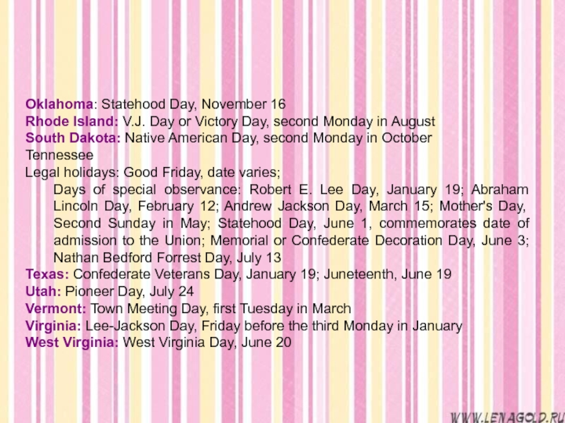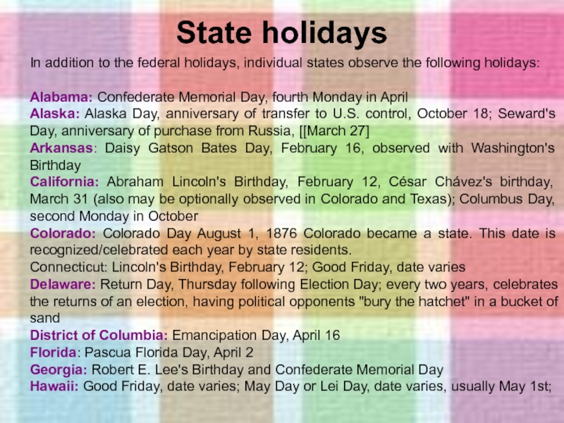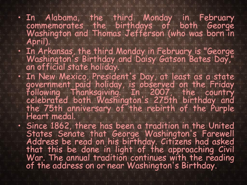 Слайд 28In Alabama, the third Monday in February commemorates the birthdays of