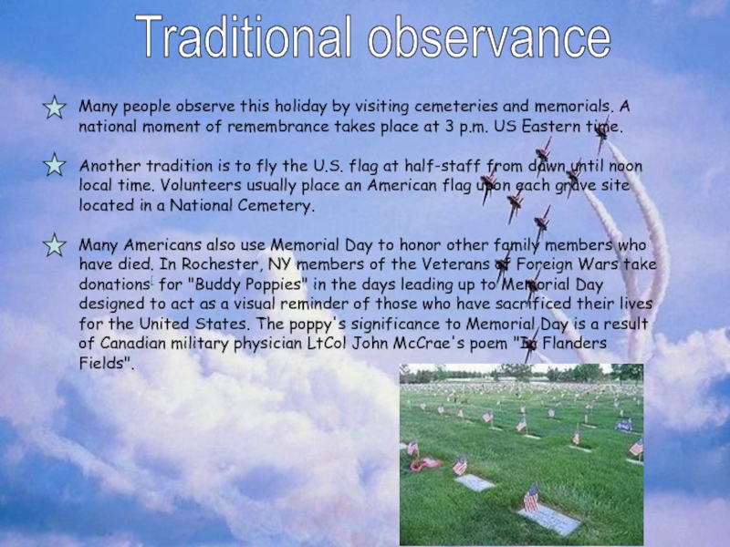 Another tradition is to fly the U.S. flag at half-staff from dawn until noon local time. Volunteers usually place an American flag upon each grave site located in a National Cemetery.