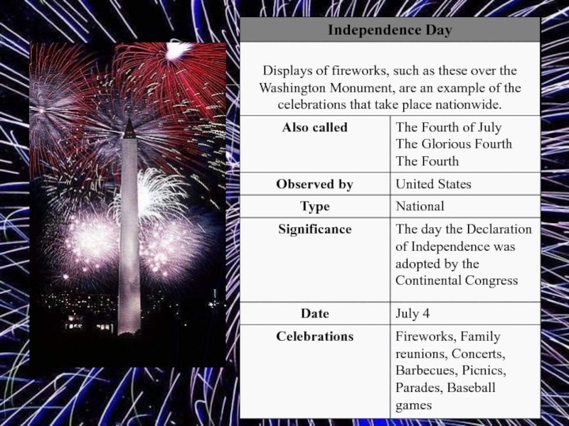 Independence Day fireworks displays are one of the most popular celebrations of patriotism during the year in the United States. This display, on Fourth of July, 1984, celebrated Independence Day as well as the centennial anniversary of the completion of the Statue of Liberty.