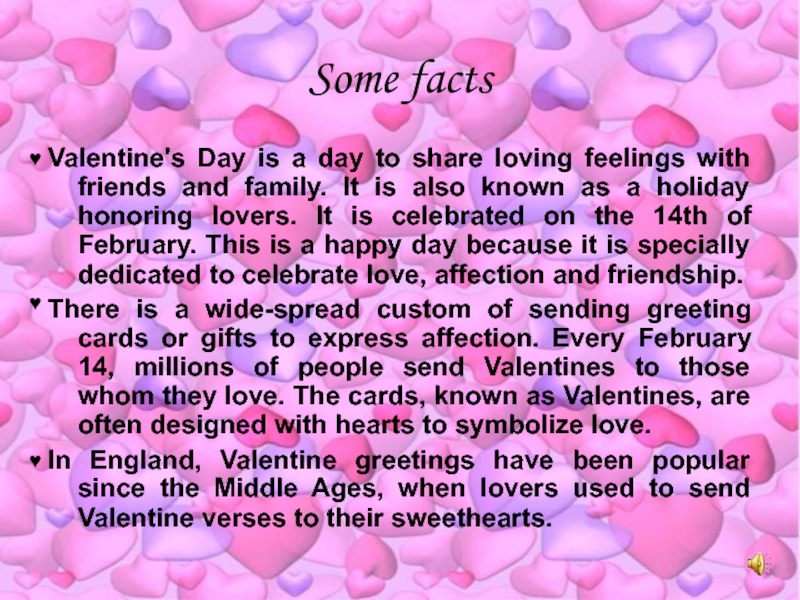 There is a wide-spread custom of sending greeting cards or gifts to express affection. Every February 14, millions of people send Valentines to those whom they love. The cards, known as Valentines, are often designed with hearts to symbolize love.