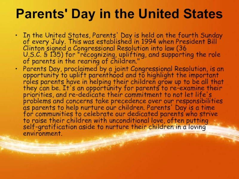 is held on the fourth Sunday of every July. This was established in 1994 when President Bill Clinton signed a Congressional Resolution into law (36 U.S.C. § 135) for "recognizing, uplifting, and supporting the role of parents in the rearing of children."
