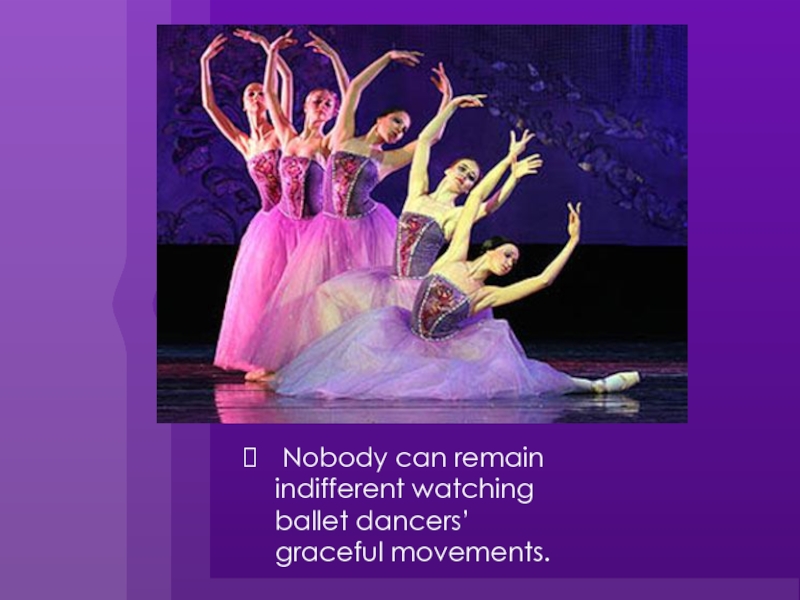 Слайд 11 Nobody can remain indifferent watching ballet dancers’ graceful movements.