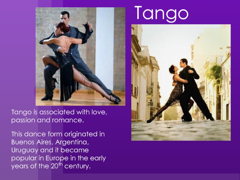 Tango   Tango is associated with love, passion and romance.   This dance form originated