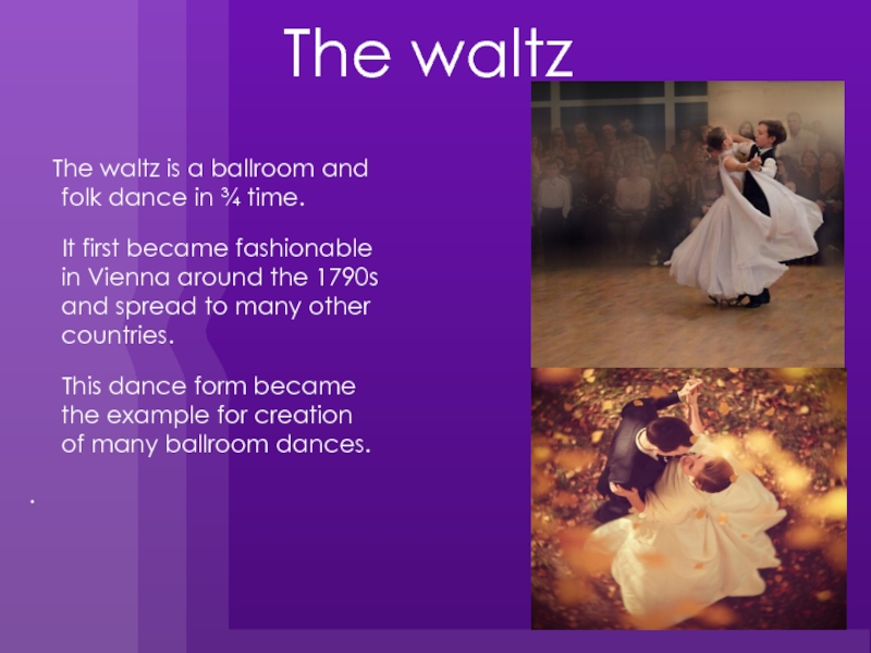 The waltz  The waltz is a ballroom and folk dance in ¾ time.   It