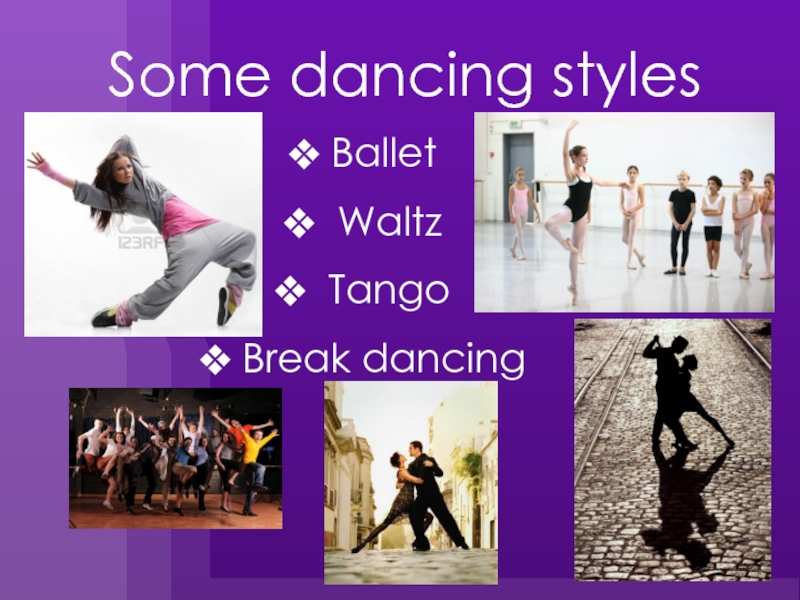 Some dancing stylesBallet Waltz TangoBreak dancing