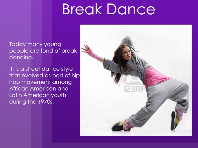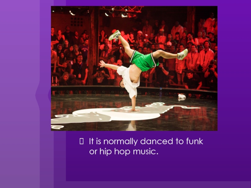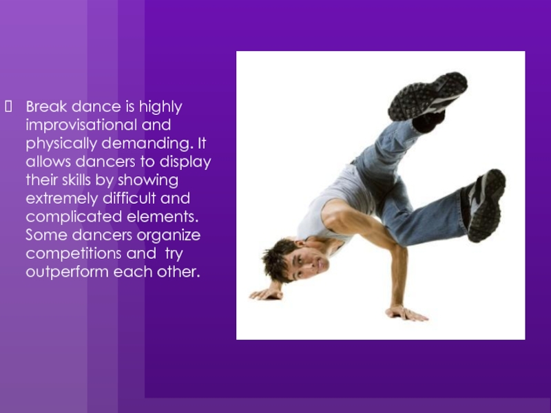 Слайд 17Break dance is highly improvisational and physically demanding. It allows dancers