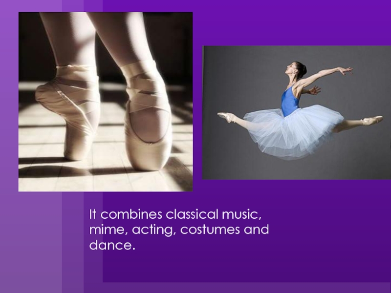 Слайд 10It combines classical music, mime, acting, costumes and dance.