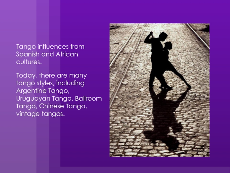 Tango influences from Spanish and African cultures.   Today, there are many tango
