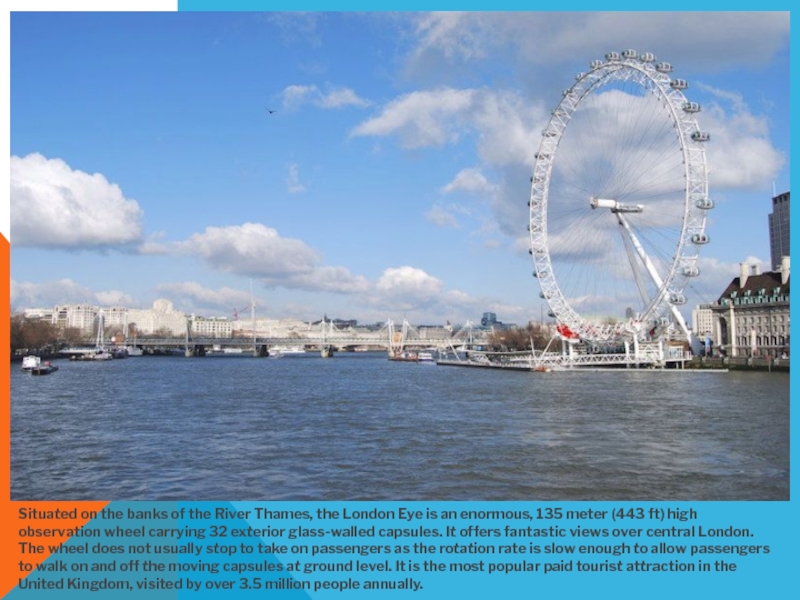 Слайд 7Situated on the banks of the River Thames, the London Eye