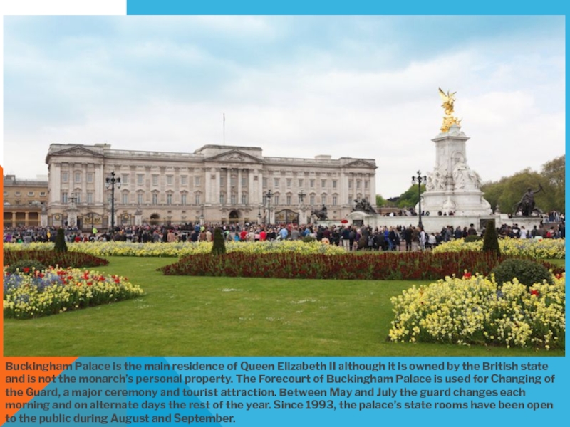 Слайд 8Buckingham Palace is the main residence of Queen Elizabeth II although