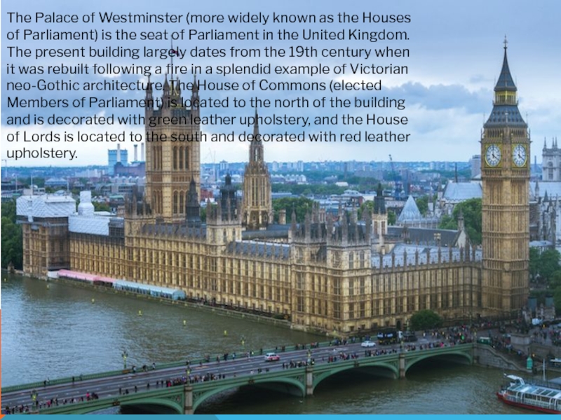 Parliament) is the seat of Parliament in the United Kingdom. The present building largely dates from the 19th century when it was rebuilt following a fire in a splendid example of Victorian neo-Gothic architecture. The House of Commons (elected Members of Parliament) is located to the north of the building and is decorated with green leather upholstery, and the House of Lords is located to the south and decorated with red leather upholstery.