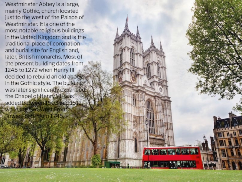 Слайд 2Westminster Abbey is a large, mainly Gothic, church located just to