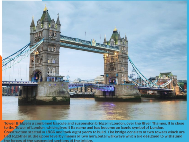 Слайд 10Tower Bridge is a combined bascule and suspension bridge in London,