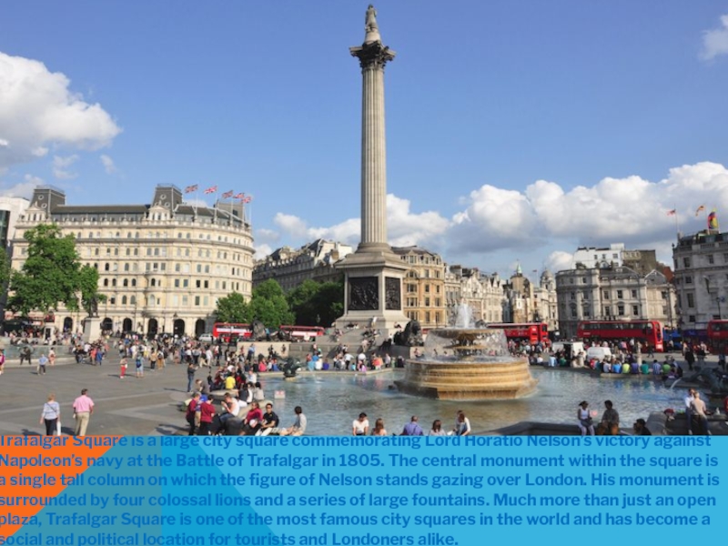 Слайд 5Trafalgar Square is a large city square commemorating Lord Horatio Nelson’s