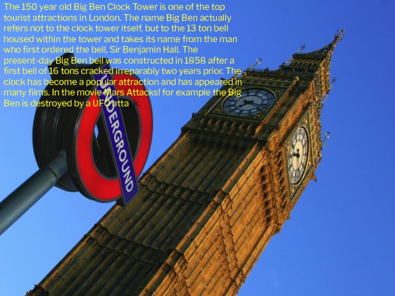 the top tourist attractions in London. The name Big Ben actually refers not to the clock tower itself, but to the 13 ton bell housed within the tower and takes its name from the man who first ordered the bell, Sir Benjamin Hall. The present-day Big Ben bell was constructed in 1858 after a first bell of 16 tons cracked irreparably two years prior. The clock has become a popular attraction and has appeared in many films. In the movie Mars Attacks! for example the Big Ben is destroyed by a UFO attack.