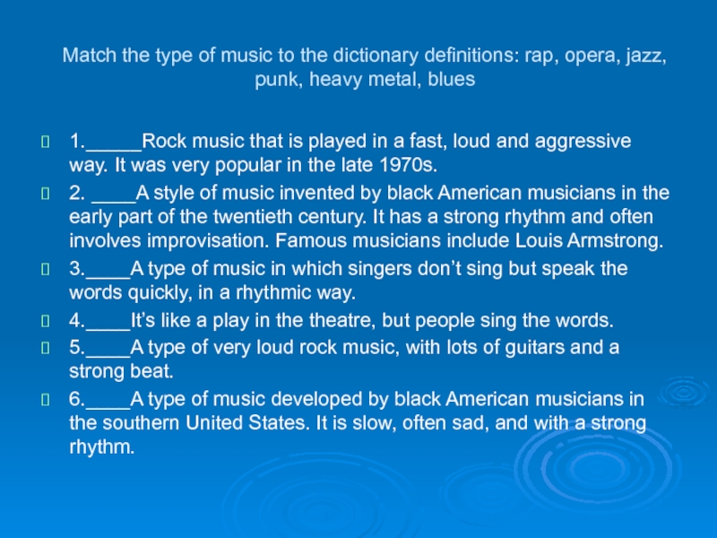 3.____A type of music in which singers don’t sing but speak the words quickly, in a rhythmic way.