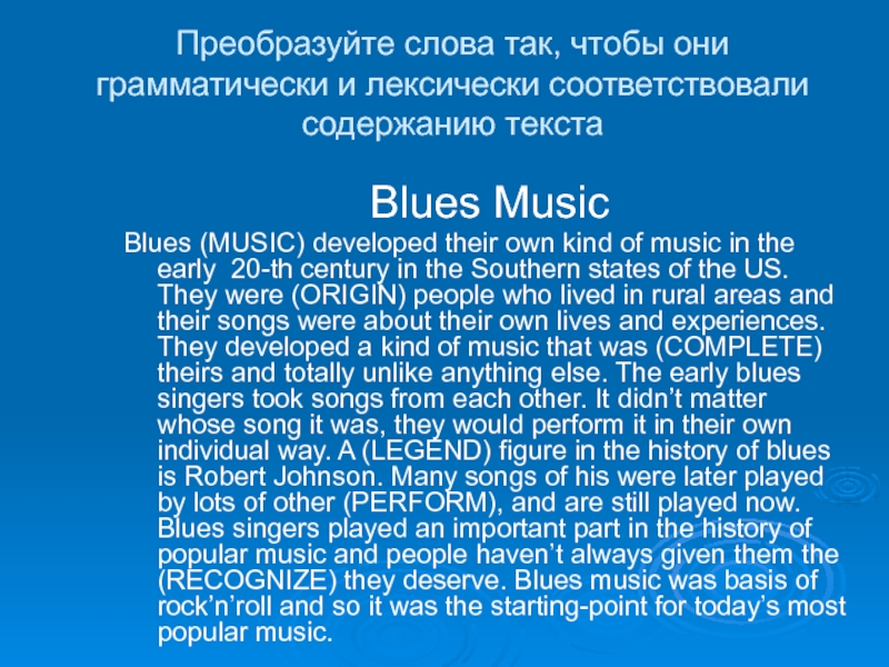 6.____A type of music developed by black American musicians in the southern United States. It is slow, often sad, and with a strong rhythm.