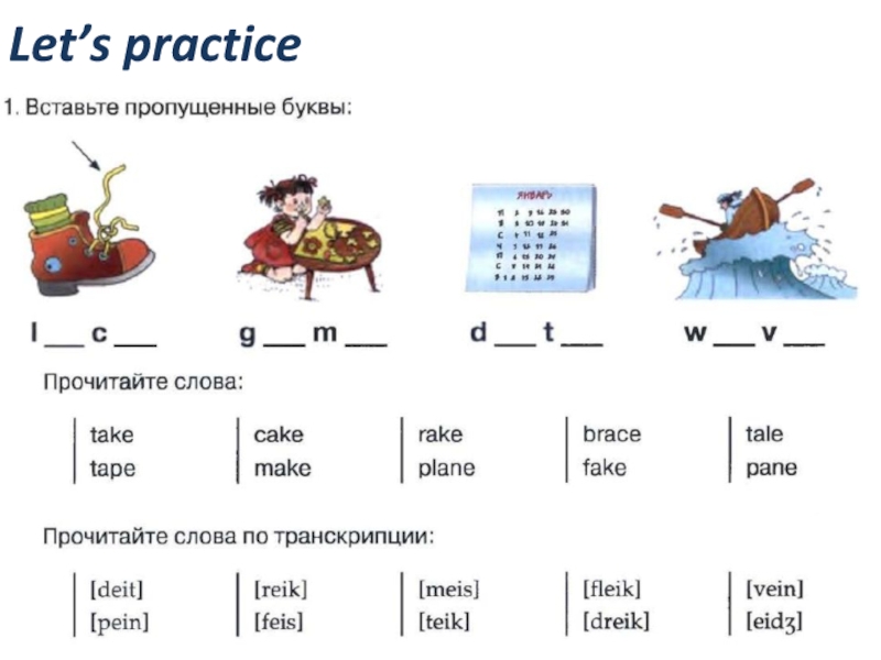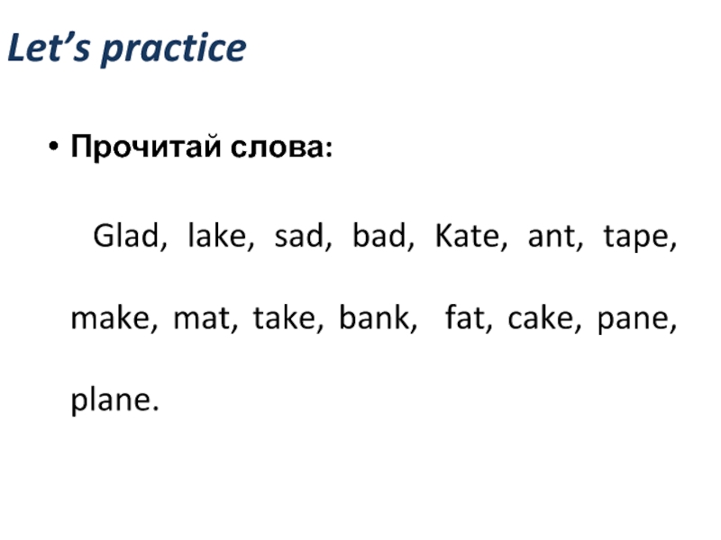 Glad, lake, sad, bad, Kate, ant, tape, make, mat, take, bank, fat, cake, pane, plane.