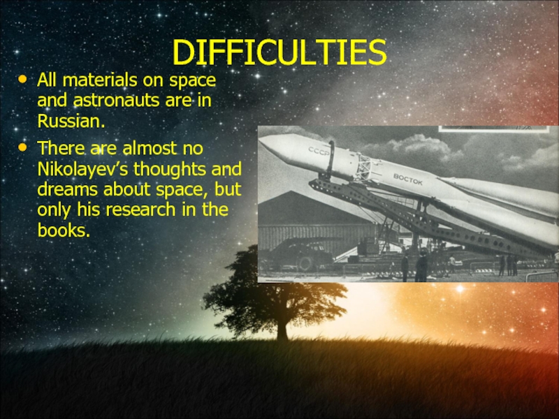 almost no Nikolayev’s thoughts and dreams about space, but only his research in the books.