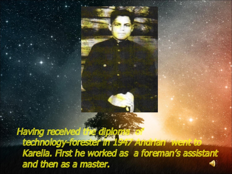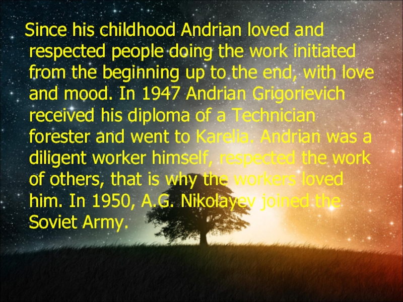 work initiated from the beginning up to the end, with love and mood. In 1947 Andrian Grigorievich received his diploma of a Technician forester and went to Karelia. Andrian was a diligent worker himself, respected the work of others, that is why the workers loved him. In 1950, A.G. Nikolayev joined the Soviet Army.