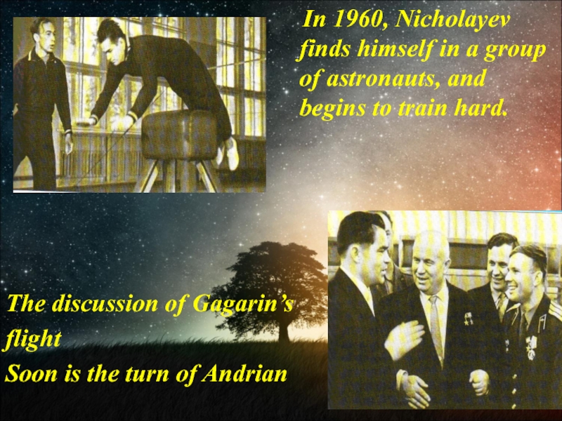1960, Nicholayev finds himself in a group of astronauts, and begins to train hard.
