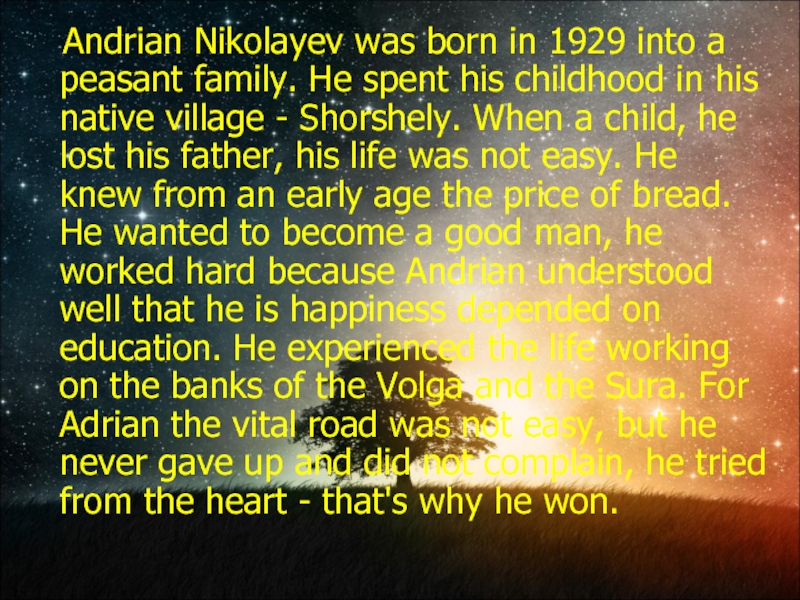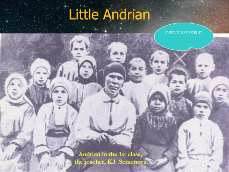 Слайд 7 Andrian Nikolayev was born in 1929 into a peasant