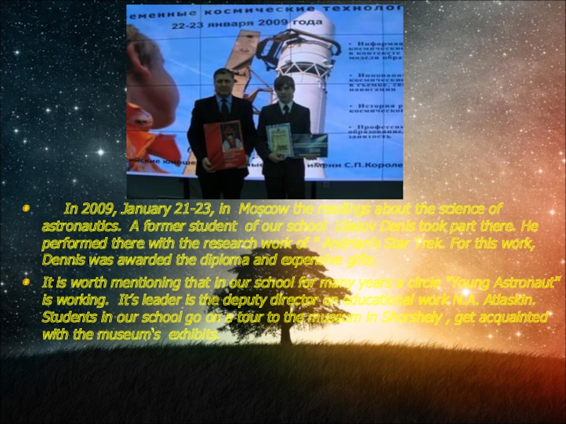 In 2009, January 21-23, in Moscow the readings about the science of astronautics. A former student of our school Ulasov Denis took part there. He performed there with the research work of " Andrian’s Star Trek. For this work, Dennis was awarded the diploma and expensive gifts.