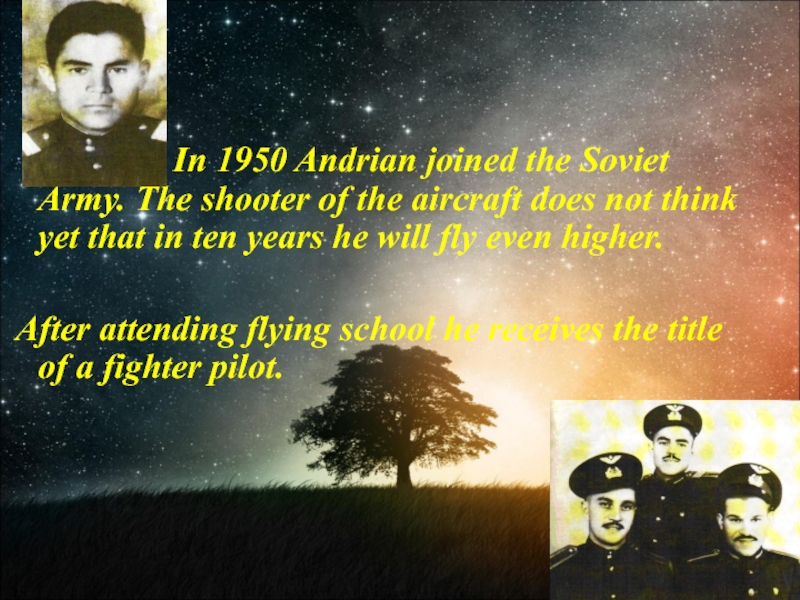 Andrian joined the Soviet Army. The shooter of the aircraft does not think yet that in ten years he will fly even higher.