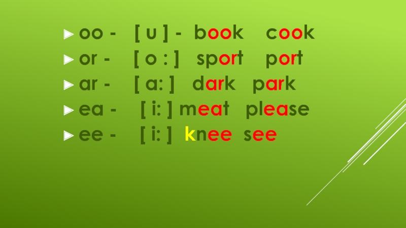 oo - [ u ] - book cookor - [ o : ] sport portar - [ a: ] dark parkea - [ i: ] meat