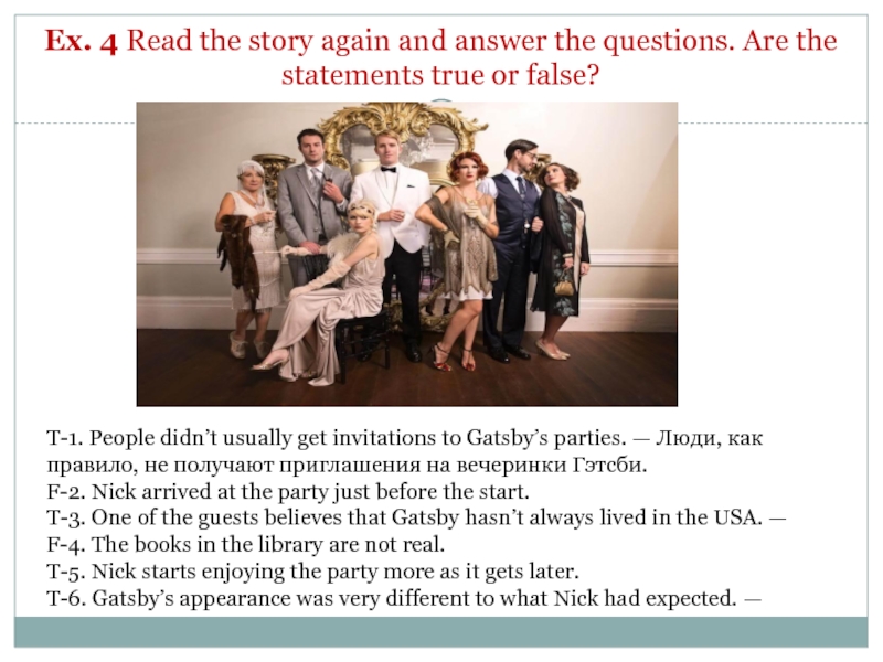 T-1. People didn’t usually get invitations to Gatsby’s parties. — Люди, как правило, не получают приглашения на вечеринки Гэтсби.
