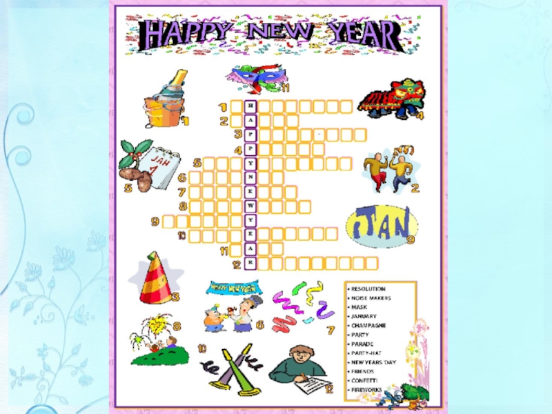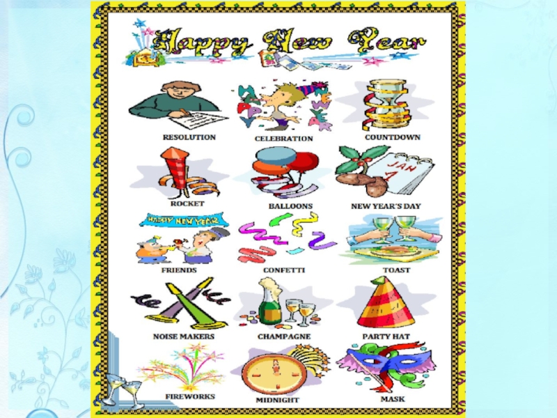 They decorate a fir-tree with toys, coloured balls and sweets. People have New Year parties at home. They cook tasty food for dinner and invite their friends. At 12 o’clock they wish one another “A happy New Year”.