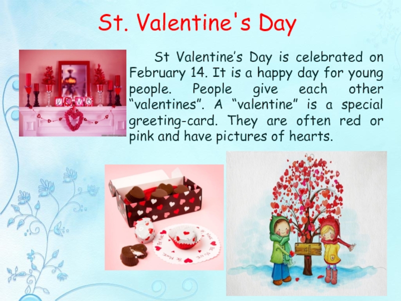 St. Valentine's Day St Valentine’s Day is celebrated on February 14. It is a happy day for young people. People give each other “valentines”. A “valentine” is a special greeting-card. They are often red or pink