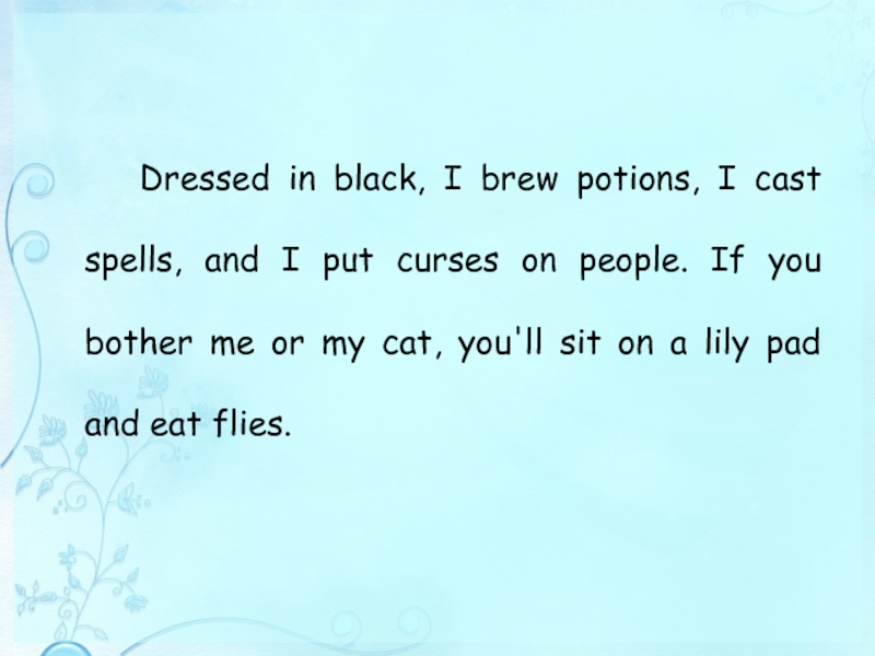 Слайд 40 Dressed in black, I brew potions, I cast spells, and I