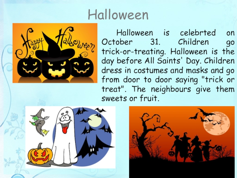 Halloween is celebrted on October 31. Children go trick-or-treating. Halloween is