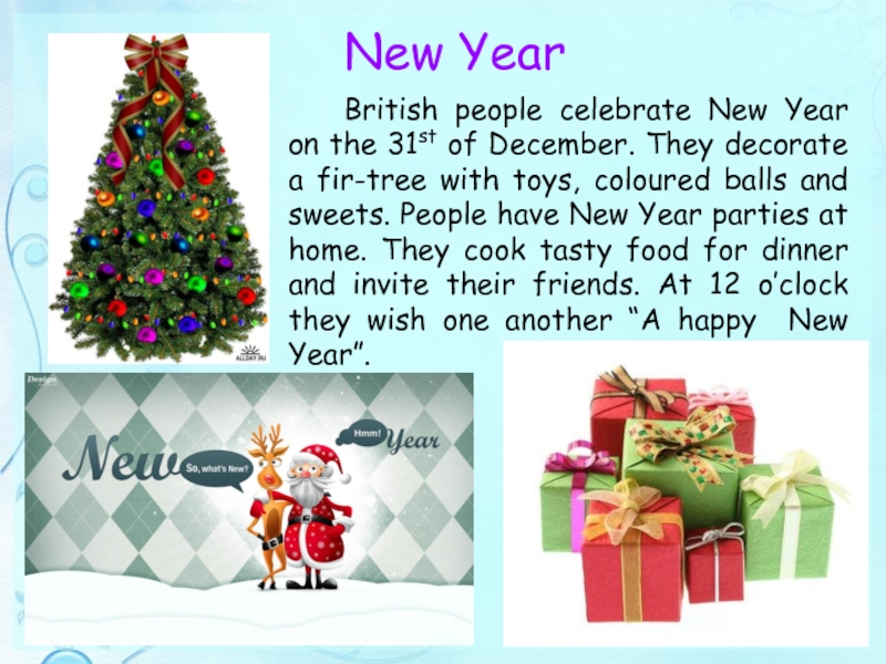 New Year		British people celebrate New Year on the 31st of December. They decorate a fir-tree with toys,