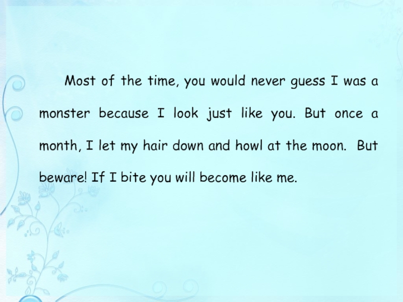 monster because I look just like you. But once a month, I let my hair down and howl at the moon. But beware! If I bite you will become like me.